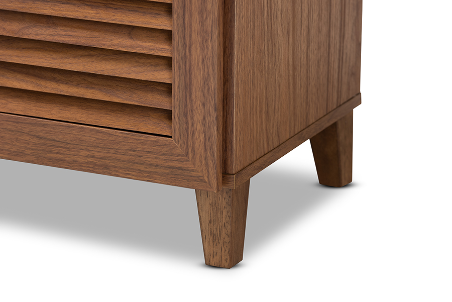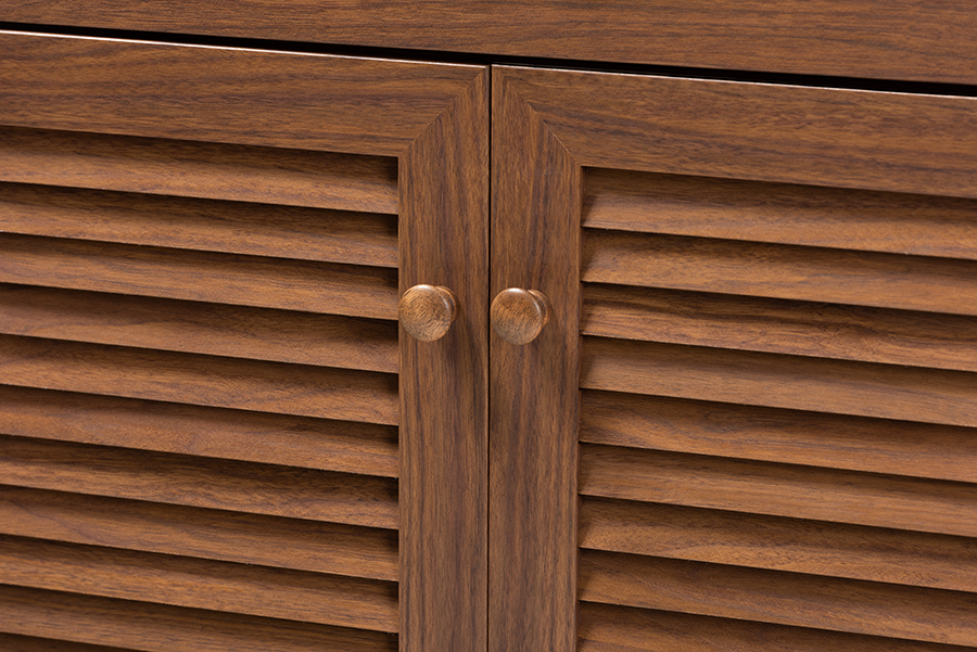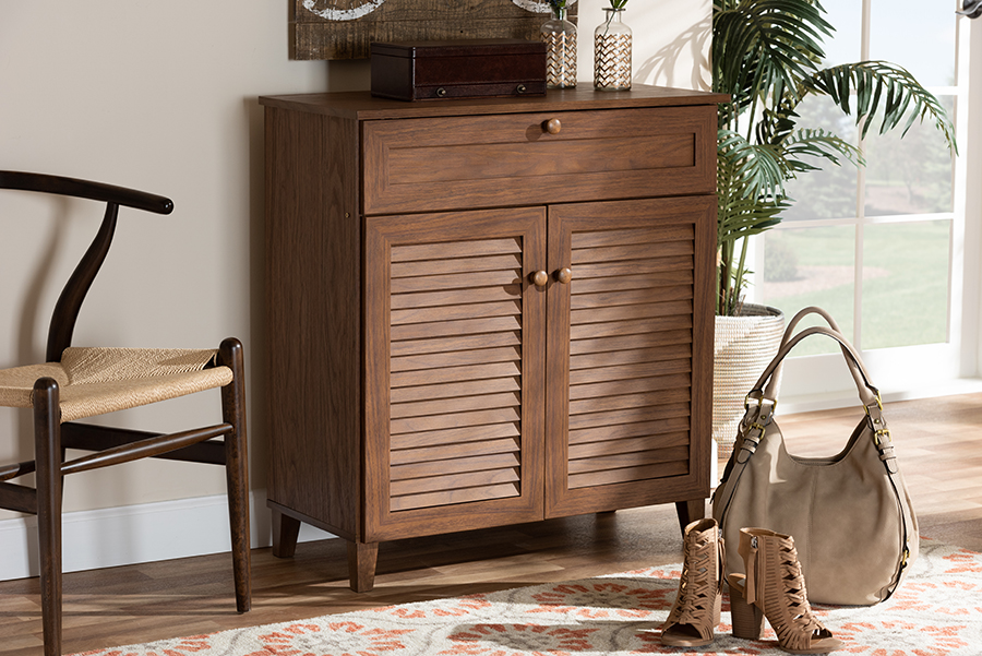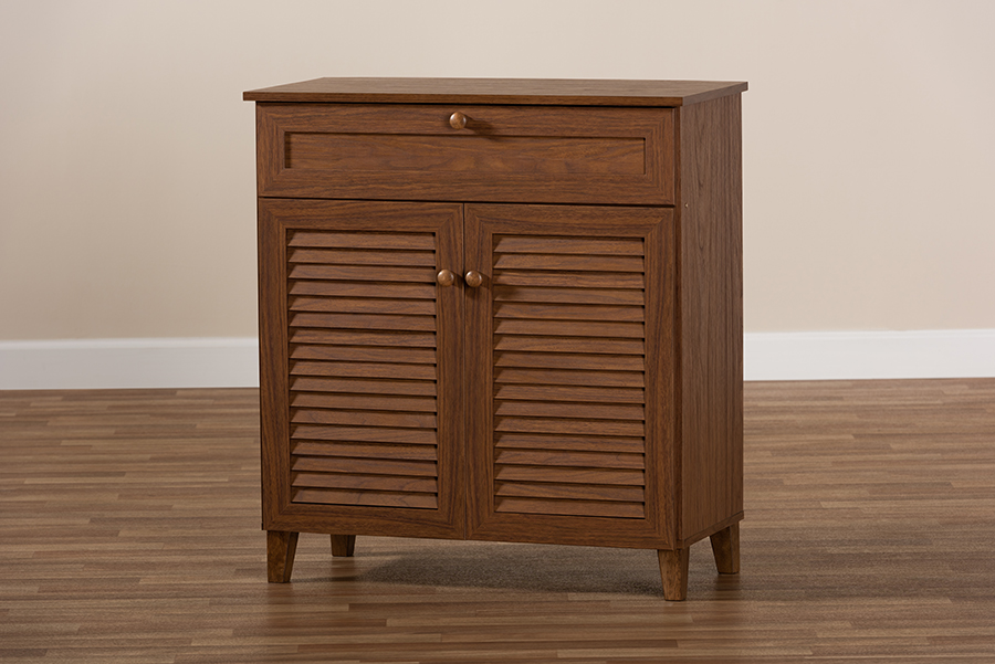 The details of this Baxton Studio Coolidge Modern and Contemporary Walnut Finished 4-Shelf Wood Shoe Storage Cabinet with Drawer will enhance your Entryway Furniture and your living space: