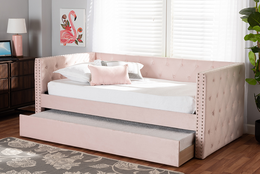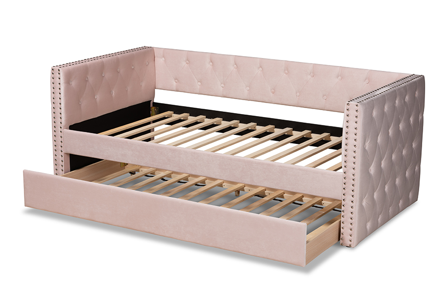 The details of this Baxton Studio Larkin Modern and Contemporary Pink Velvet Fabric Upholstered Twin Size Daybed with Trundle will enhance your Kids Room Furniture and your living space: