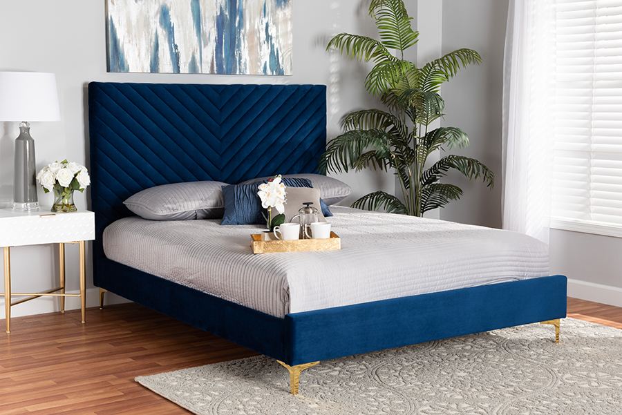 The details of this Baxton Studio Fabrico Contemporary Glam and Luxe Navy Blue Velvet Fabric Upholstered and Gold Metal Queen Size Platform Bed will enhance your Bedroom Furniture and your living space: