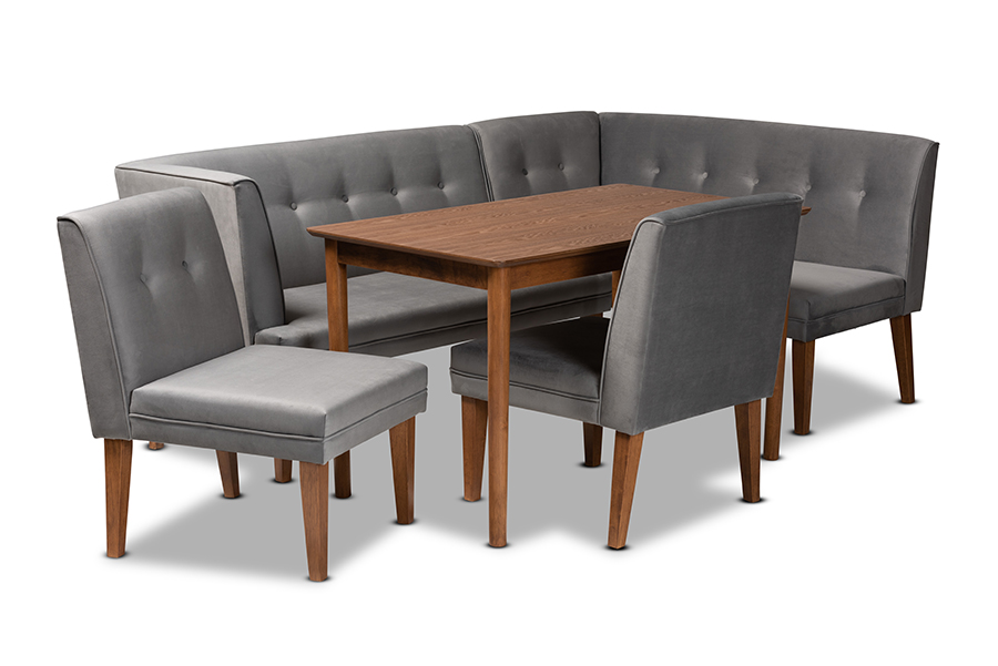 Baxton Studio Stewart Mid-Century Modern Grey Velvet Upholstered and Walnut Brown Finished Wood 5-Piece Dining Set