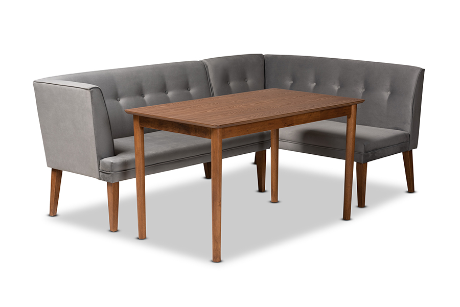 Baxton Studio Stewart Mid-Century Modern Grey Velvet Upholstered and Walnut Brown Finished Wood 3-Piece Dining Nook Set