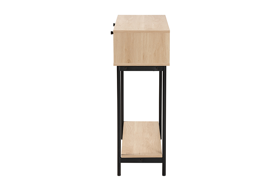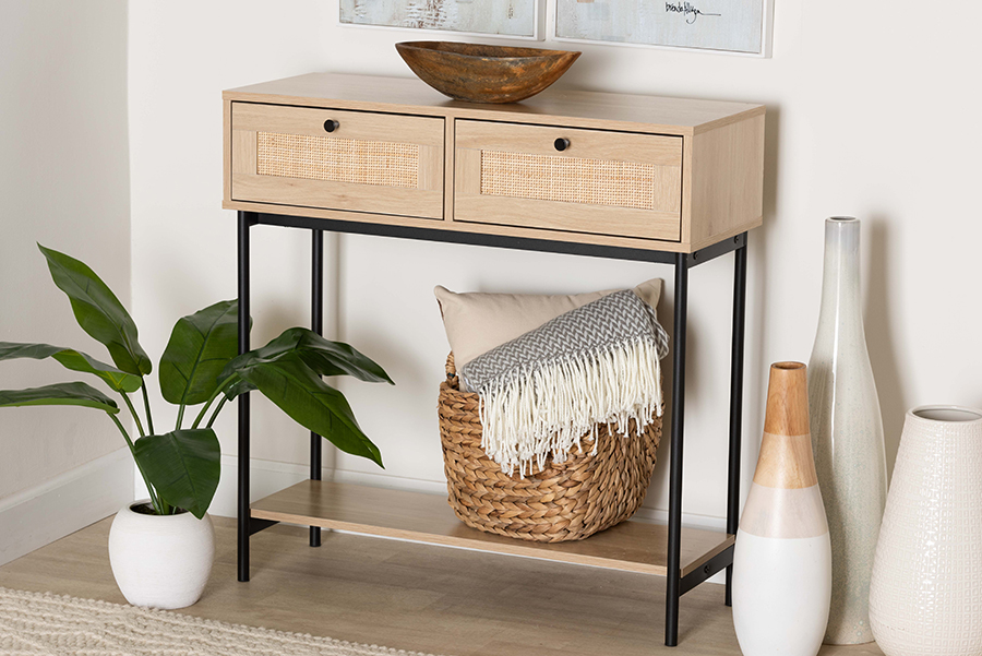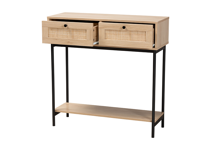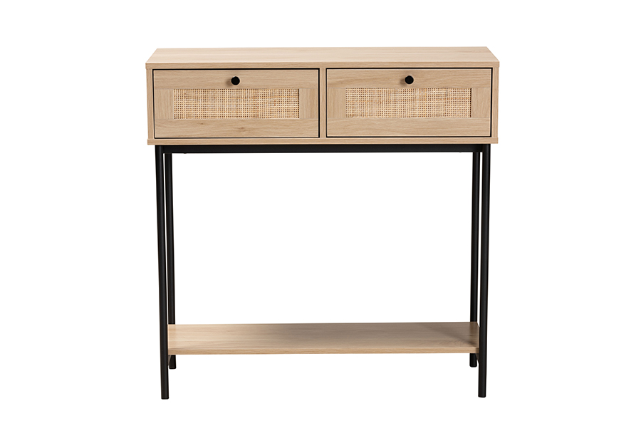 Baxton Studio Sherwin Mid-Century Modern Light Brown  and Black 2-Drawer Console Table with Woven Rattan Accent