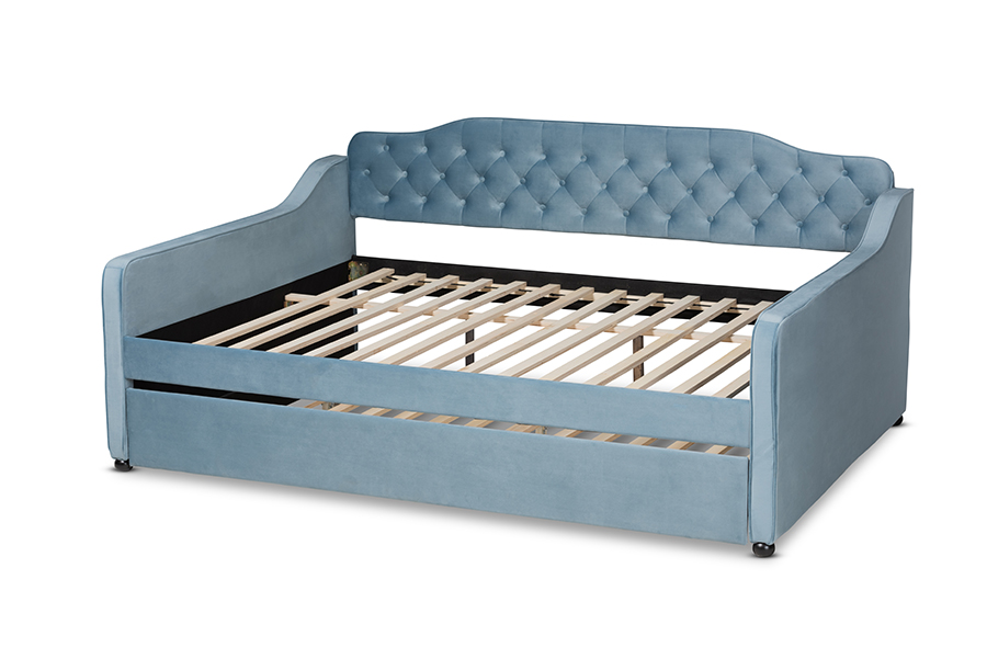 The details of this Baxton Studio Freda Transitional and Contemporary Light Blue Velvet Fabric Upholstered and Button Tufted Full Size Daybed with Trundle will enhance your Kids Room Furniture and your living space: