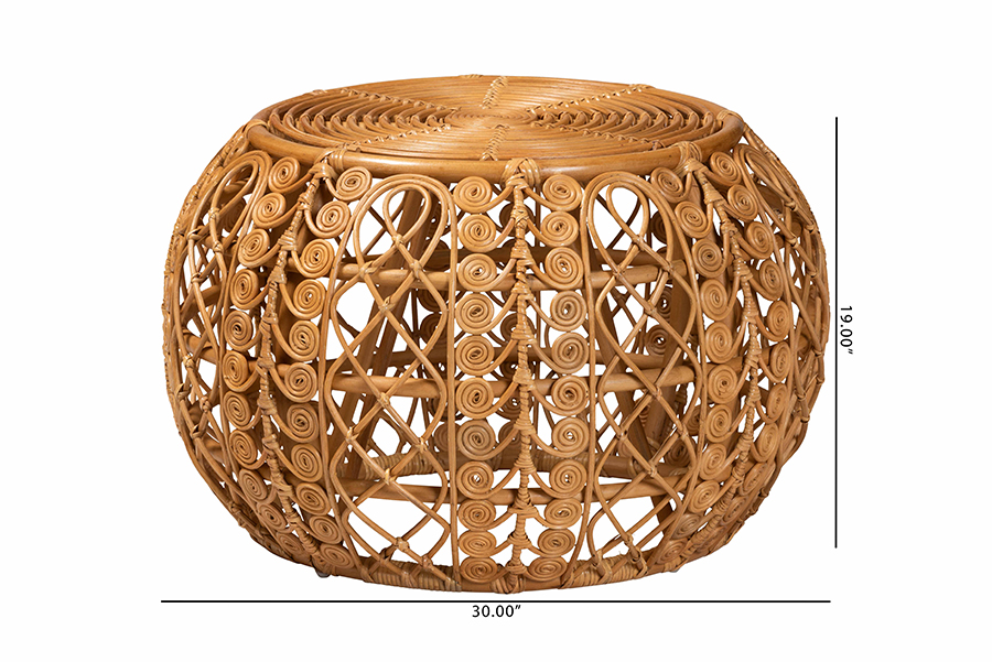 Take hold of a tranquil atmosphere by anchoring your space with the stunning Tiramisu coffee table. Made in Indonesia, this bohemian piece is entirely handcrafted from natural rattan. Its round silhouette features a lovely openwork design embellished with smooth geometric allure. The Tiramisu will arrive fully assembled and features an open, rounded base for excellent stability and support while maintaining a lightweight, airy design. A fantastic complement for any lounge setting, the Tiramisu coffee table elevates any layout. Rattan is a product of nature and may have variations in areas such as, but not limited to, color, pattern, grain and texture. The hair-like strands of rattan/rattan-fiber are common due to the nature of the material.