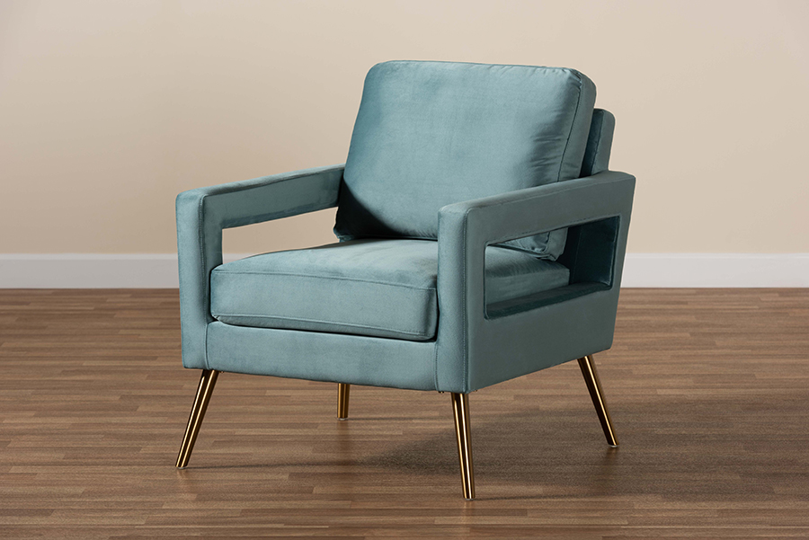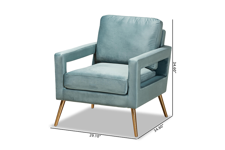 The details of this Baxton Studio Leland Glam and Luxe Light Blue Velvet Fabric Upholstered and Gold Finished Armchair  will enhance your Living Room Furniture and your living space: