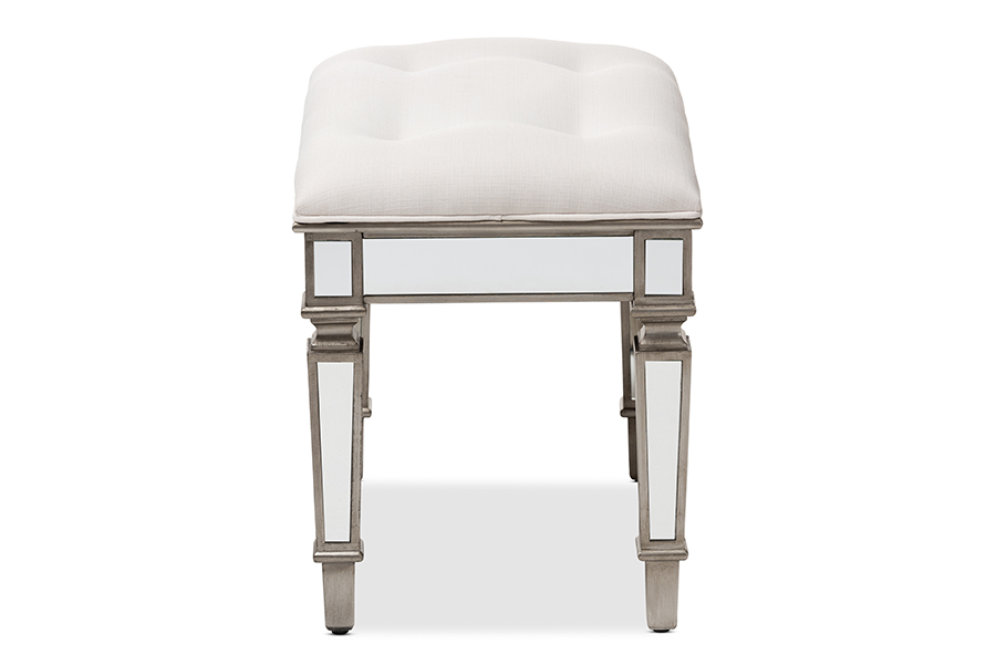 Baxton Studio Marielle Hollywood Regency Glamour Style Off White Fabric Upholstered Mirrored Ottoman Vanity Bench