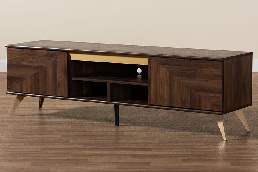 The details of this Baxton Studio Graceland Mid-Century Modern Transitional Walnut Brown Finished Wood 2-Door TV Stand will enhance your Living Room Furniture and your living space: