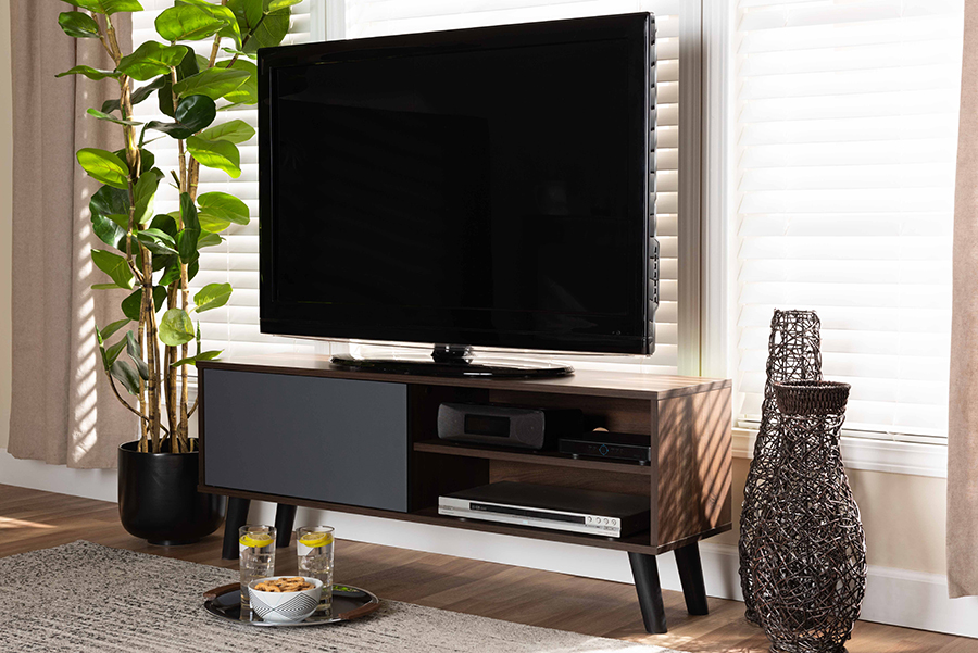 Displaying contemporary design motifs, the Mallory TV stand modernizes any space. Made in Malaysia, the Mallory is comprised of sturdy wood showcasing a two-tone finish of walnut brown and grey for a cool, modern look. Two external shelves and one additional shelf behind the door to provide easy storage for all your living room essentials. Requiring assembly, the Mallory is also equipped with a cord management hole to easily connect your media devices. Angled legs lend a chic mid-century touch. A fantastic blend of modern design and utility, the Mallory TV stand enhances any space.
